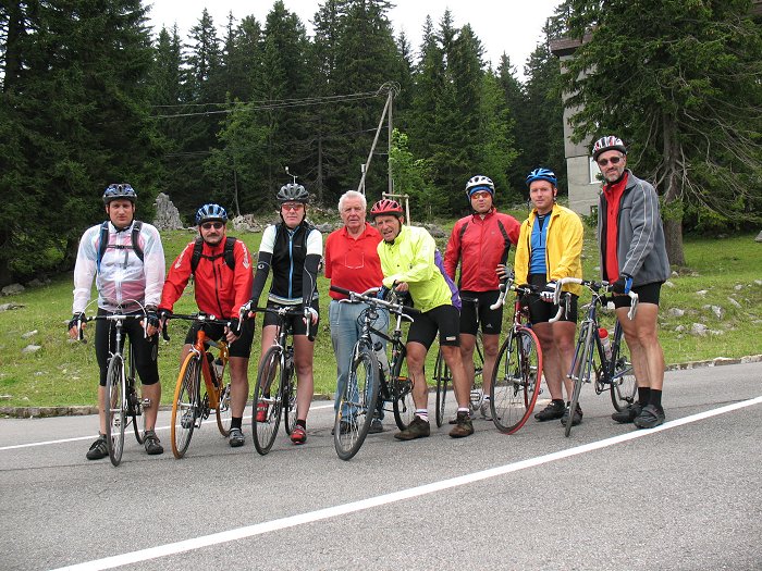 Der liebe Gott war ganz schön helle, schuf neben Steigung auch Gefälle! Der Himmel zeigt sich bewölkt, die Straßen sind noch nass vom nächtlichen Regen. Trotzdem sind wir alle motiviert und radeln der nächsten Herausforderung entgegen, dem Riedbergpass, der höchsten deutschen Passstraße. Das hört sich zunächst toll an, jedoch ist er mit seinen 1.420 Metern natürlich nicht mit den richtigen Alpenpässen zu vergleichen. Trotzdem ist er für uns eine Herausforderung, denn es gilt auf der gut 6 Kilometer langen Westauffahrt Steigungen von bis zu 16 % zu überwinden. Die steilen Stücke sind gleich zu Beginn der Strecke, kurz hinter Obermaiselstein. Wie stand es in einer Ausgabe der Roadbike, „… beim Bergfahren sollte die Trittfrequenz nicht unter 70 fallen“. Hä? Mehr als ca. 55 bekomme ich selbst im kleinsten Gang nicht hin. Was haben denn die für Beine? Egal, gedanklich schwenke ich von der Theorie zur Praxis und arbeite mich langsam hinauf. Unterwegs treffe ich auf einen jungen Mountainbiker, der mit einer geschätzten Trittfrequenz von ca. 150 hoch radelt ;-). Nach dem ich ihn überholt habe und ihm ein Stück voraus bin, werden meine Beine hart und ich muss kurz pausieren. Natürlich fährt der Kerl wieder an mir vorbei und weiter unten sehe ich auch schon Silvia näher kommen. Nun gut, die Beine scheinen wieder zu wollen und ich bewege mich weiter den Berg hinauf. Nach einiger Zeit steht der Jüngling am Straßenrand und nestelt an seinem Rucksack herum. Ha, jetzt hab ich dich! Kurze Zeit später die Ernüchterung. Silvia fliegt förmlich an mir vorbei und versucht anscheinend auch noch Holger einzuholen, der in einiger Entfernung vor mir fährt. Später, auf der Passhöhe, steht dann die Reihenfolge fest, bewiesen durch Sepps Zielfotos: Sepp, Reinhard, Holger, Silvia, Carlo, Hanspeter, Thorsten und als letztes der MTB-Jüngling – Trittfrequenz hin oder her ;-). In Hittisau bemerkt Holger, dass ihm eine Speiche gerissen ist. Er lädt sein Bike in den Hänger und will mit José die Fahrradläden auf der Strecke abklappern, um den Schaden reparieren zu lassen. Wir anderen fahren dann ohne ihn weiter und biegen dann kurz vor Aach links auf eine schmale Straße ab. Und dann geht es wieder auffi. 19 % blinkt mir das GPS frech ins Gesicht und ich kann mich nicht mal wehren. Doch irgendwie klappt das jetzt langsam (im doppelten Sinn) mit dem Bergfahren, ein gewisser Trainingseffekt lässt sich nicht verleugnen. Kaum haben wir uns wieder ins jenseitige Tal hinabgestürzt, kommt schon der nächste steile Anstieg. Dann endlich eine kurze Pause, dabei versuchen wir uns zu orientieren. Wir vergleichen Karte mit GPS und sprechen der Elektronik unser Vertrauen aus. Schon ein paar hundert Meter später ist der Weg zu Ende – das Vertrauen ins GPS allerdings auch ;-). Doch keiner von uns möchte wieder zurück und sich über die Anstiege quälen. Wir beschließen die Räder über eine Wiese zu schieben und so den Weg hinter einem Gehöft zu erreichen. Dazu müssen wir mitten auf der Wiese die Grenze von Österreich nach Deutschland überschreiten. Das ist hier im wahrsten Sinne des Wortes eine wirklich grüne Grenze. Neben dem Grenzstein gibt es einen Stacheldrahtzaun, der überwunden werden muss. Dieser hat natürlich nicht den Sinn, die Grenze zu sichern, sondern das liebe Vieh, das momentan zum Glück nicht auf der Weide ist, vor der Flucht zu hindern. Nach weiterem Geschiebe, diesmal auf der heimatlichen Seite der Grenze, erreichen wir endlich den ersehnten Fahrweg. Doch ein Grund zur Freude ist dieser auch nicht unbedingt, denn nun wir müssen wir weitere steile Kehren im 20 % Bereich überwinden. Noch bis Scheidegg werfen sich uns immer wieder teils sehr steile Stücke in den Weg, dann kommt endlich die Abfahrt zum Bodensee hinunter. Hanspeter und ich liefern uns wieder ein Rennen. In den engen Kurven zieht er an mir vorbei, bei den größeren Radien bin ich der Schnellere. Sepp schaut sich das von hinten an, seine späteren Kommentare zu unserer Fahrweise, lasse ich an dieser Stelle mal weg ;-). Bei Bregenz erreichen wir das Ufer des Schwäbischen Meeres. Dank Radweg können wir dem Dosenstau entgehen und kommen rasch vorwärts. Etwas Eile ist nun auch geboten, denn gerade beginnen erste Regentropfen eine Wetteränderung anzukündigen. Dank dem elektronischen Helfer, hier macht er seine Arbeit richtig, finden wir ohne Umwege und rechtzeitig vor dem Nasswerden (vom Schweiß natürlich abgesehen) unser Etappenziel. Holger und José sind bereits da, Holgers Rad ist auch schon repariert und morgen ist er wieder mit dabei. Praktischerweise hat unser Haus wieder eine Sauna, die wir auch gleich anwerfen lassen.